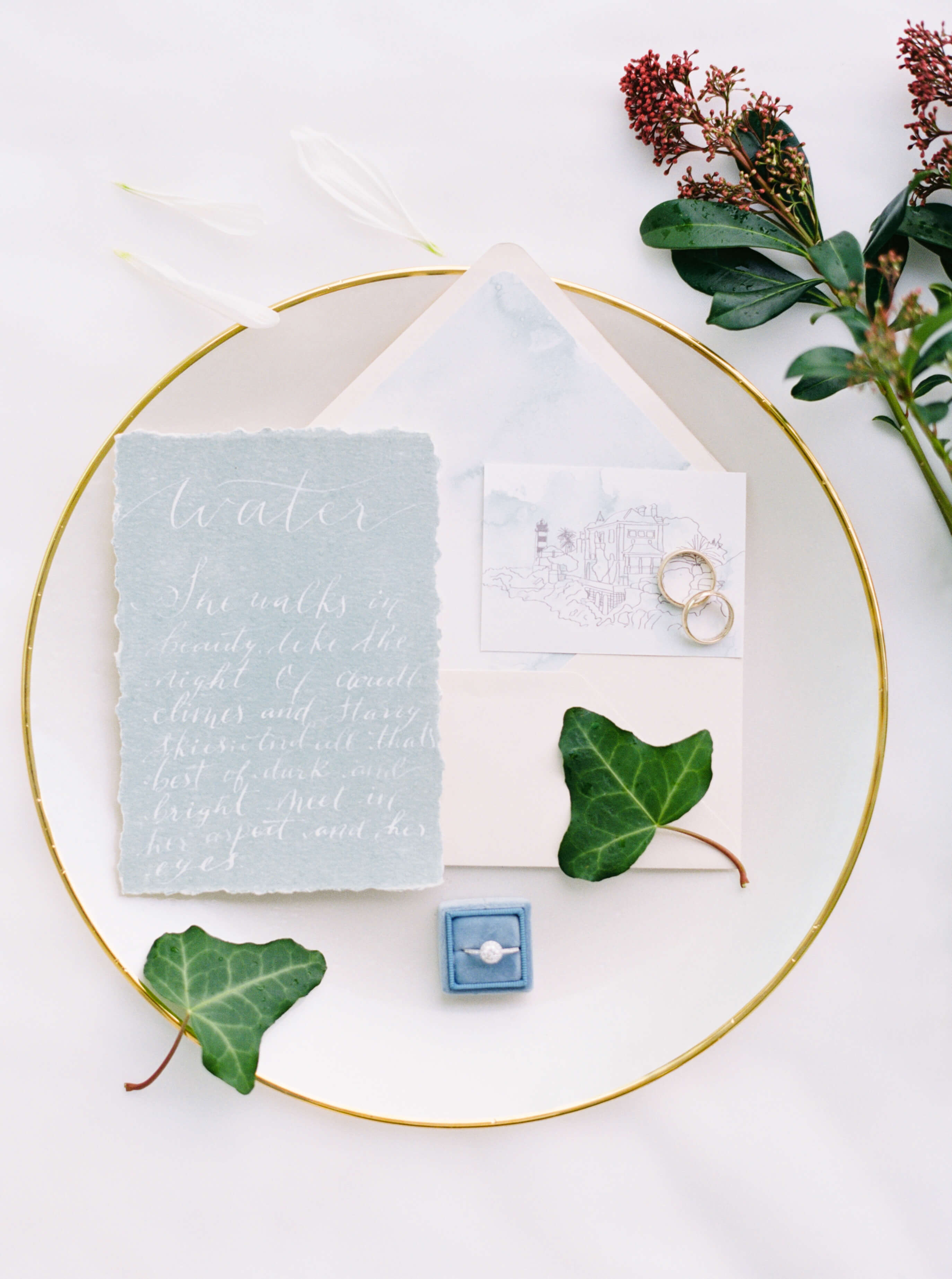 We wanted to show an airy, minimalist, sophisticated concept with a vintage touch. Our colour palette was a mix of pastels tones, dusty blues and dashes of gold with pops of greenery throughout the shoot.